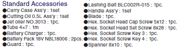| Battery Pack: | DC 18 V 4.0 Ah (Li-ion) model NBL18006 |